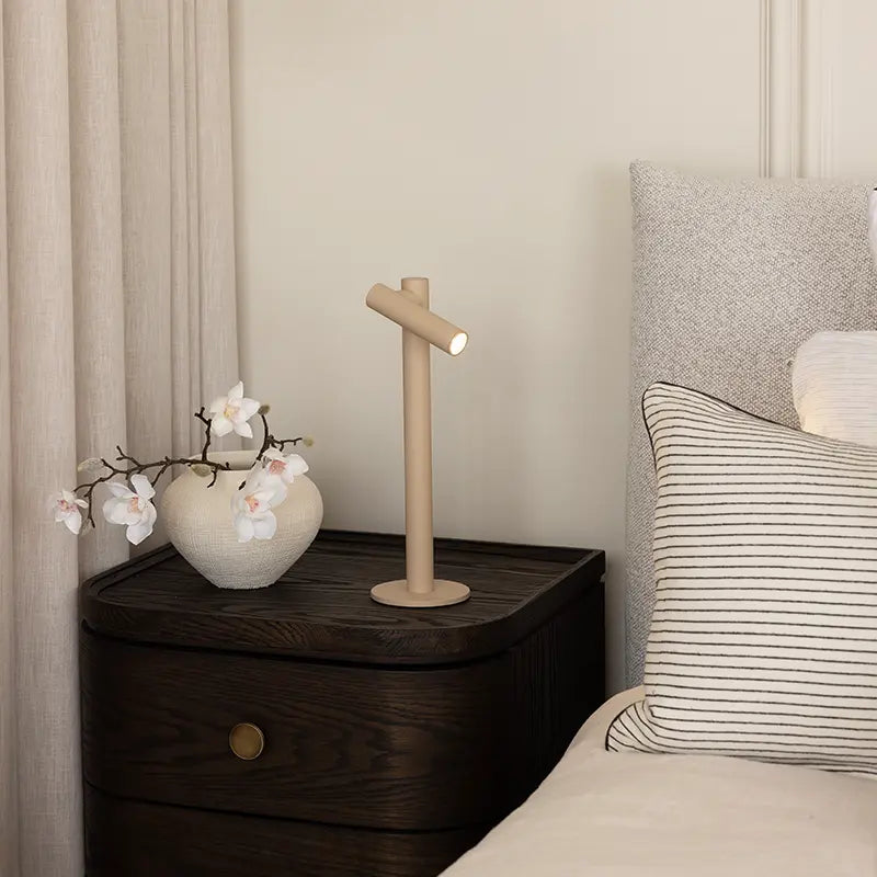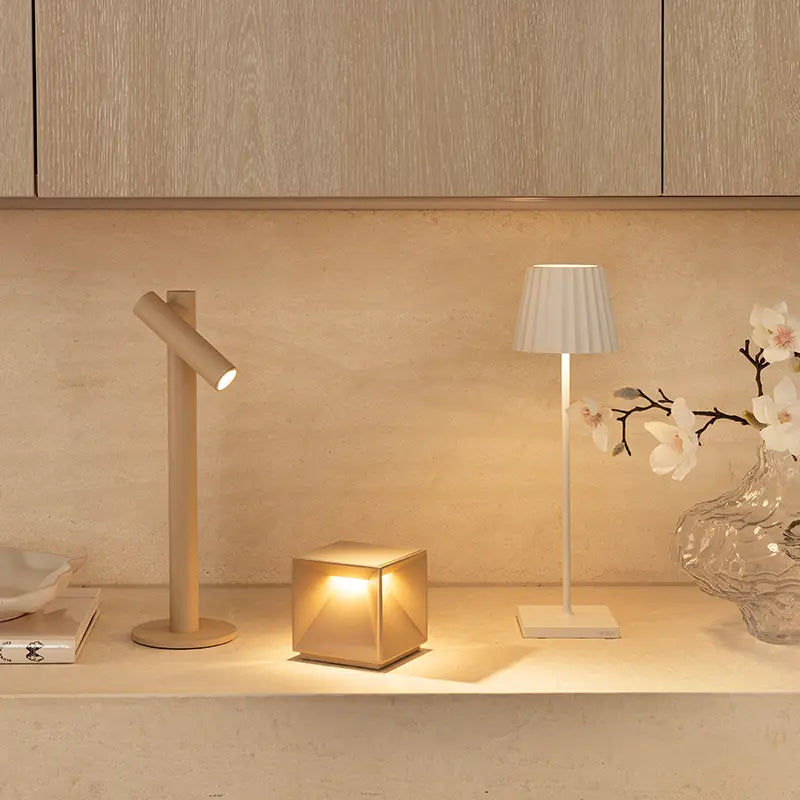 Rechargeable, dimmable table lamp with 360 degree rotatable head.